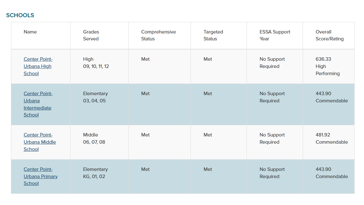 | The Iowa School Performance Profiles is an online tool showing how public schools performed on required measures. The website was developed to meet both federal and state requirements for publishing online school report cards. Detailed information about the Center Point-Urbana CSD including specific schools, demographics, etc. may be found at the link above. Below are the profile rankings snapshots for Center Point-Urbana CSD: |