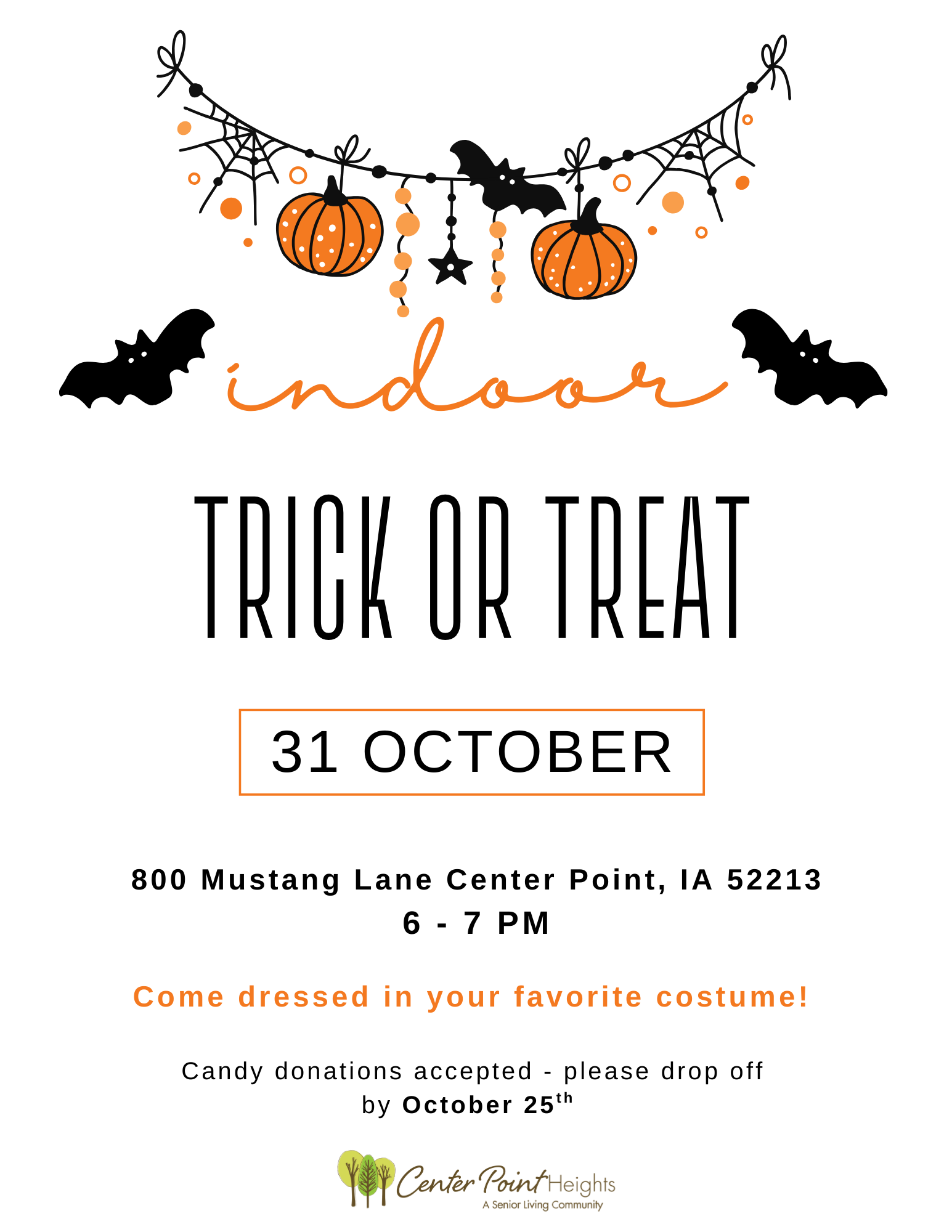 Center Point Heights is hosting an indoor trick-or-treat event on Friday, October 31st!
